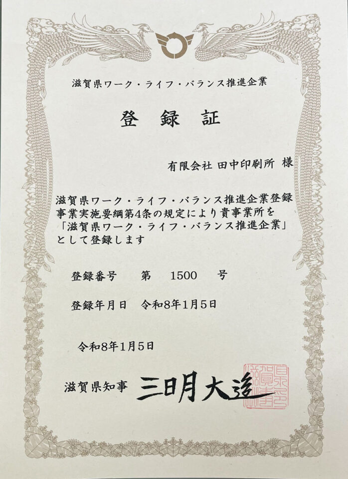 田中印刷所ホーム 〉 News 〉 『滋賀県ワーク・ライフ・バランス推進企業』に登録されました。